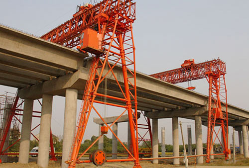 用于船臺拼裝船體,常備有兩臺起重小車:一臺有兩個主鉤,在橋架上翼緣的軌道上運行;另一臺有一個主鉤和一個副鉤,在橋架下翼緣的軌道上運行,以便翻轉和吊裝大型的船體分段。起重量一般為100~1500噸;跨度達185米;起升速度為2~15米/分,還有0.1~0.5米/分的微動速度。